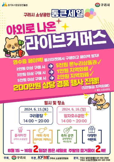 이번 행사는 경기도시장상권진흥원에서 주관하는 ‘경기 살리기 통 큰 세일’ 공모 사업에 구리시가 구리시 소상공인연합회와 함께 공모하여 확보한 사업비(5천만 원)를 통해 진행된다.