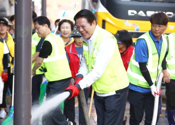 시 직원 등은 고압살수차량을 이용해 거리의 오래된 오염원 제거에 나섰고, 단체 참여자들은 담배꽁초 등 쓰레기 수거, 진열대·벤치 등 시설물 정리 등을 실시했다.