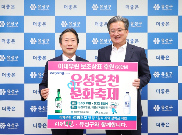 ㈜선양소주는 이달부터 지역 대표 소주인‘이제우린’20만병에 2024 유성온천문화축제 홍보 라벨지를 제작해 대전・세종・충청 지역에 유통 중이며, 2019년부터 지역의 미래 인재 양성을 위해 ‘이제우린’과 ‘선양’ 소주가 판매될 때마다 한 병당 5원씩 적립해 장학금을 기부하는 ‘이제우린 지역사랑 장학캠페인’을 진행중으로, 지난 10년간 40억 기부를 목표로 현재까지 총1,142,764,400원을 기부·적립했다.