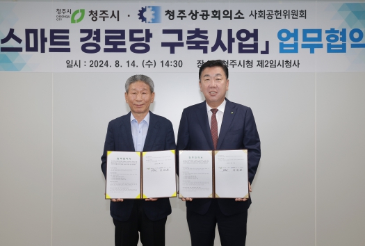 [뉴스서치] 청주시는 14일 청주상공회의소와 업무협약을 체결하고 관내 경로당 50개소에 공공와이파이를 설치하는 내용의 스마트 경로당 구축 사업 추진한다고 밝혔다.