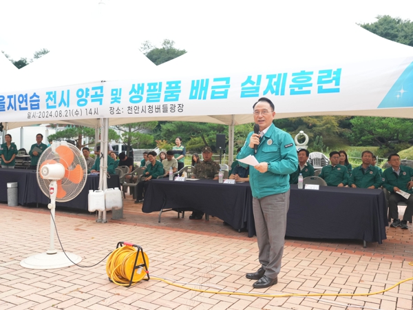 [뉴스서치] 천안시는 21일 시청 버들광장에서 2024년 을지연습 실제훈련인 ‘전시 양곡·생필품 배급’을 실시했다.