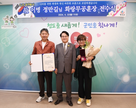 [뉴스서치] 청도군은 지난 22일 군청 군수실에서 故정만길 이병의 6.25 전쟁 참전 화랑무공훈장 전수식이 개최됐다. 이날 전수식에서는 고인이 되신 故정만길 이병을 대신하여 자녀 정성식씨와 정영숙씨가 유가족 대표로 훈장을 전수 받았다.