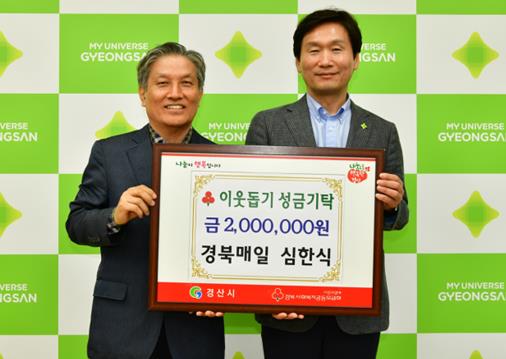 [뉴스서치] 심한식 경북매일신문 기자가 13일 경산시청을 방문해 작년에 이어 이웃돕기 성금 200만원을 기탁하며 훈훈함을 안겼다.