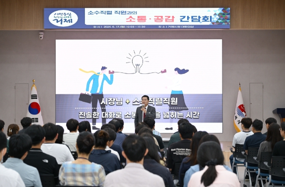 [뉴스서치] 박종우 거제시장은 지난 17일 시청 대회의실에서 오전과 오후 2회에 걸쳐 소수 직렬 직원 200여명과 함께 소통·공감 간담회를 개최했다.