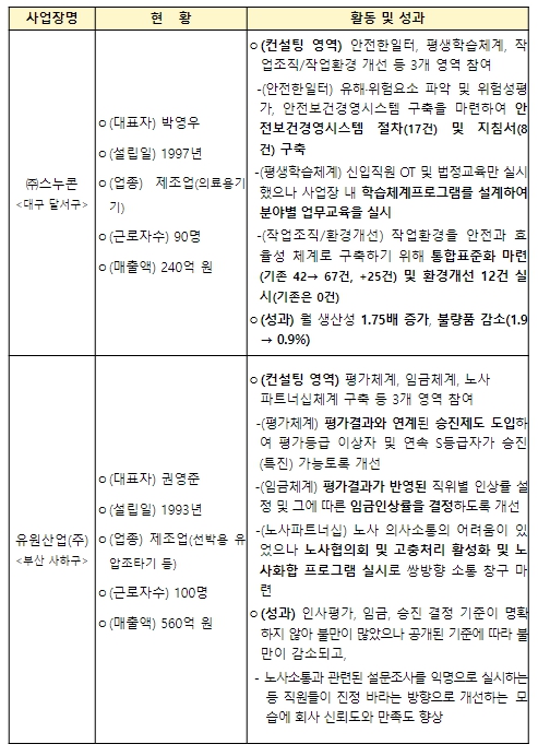 ▲ 사례 발표 기업의 일터혁신 활동 및 성과 |