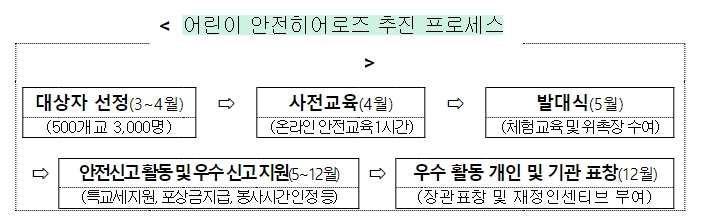 ‘어린이 안전히어로즈’는 4월부터 전국 500개 초등학교의 4~6학년 어린이 3,000명 이상을 대상으로 모집하며 5월에 시도별 발대식 이후 본격적으로 활동할 계획이다.