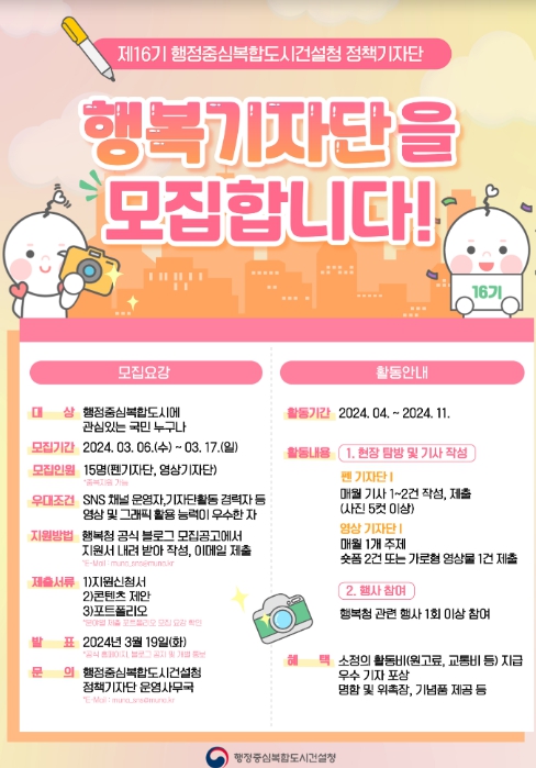 [뉴스서치] 행복청은 행복도시 건설사업을 젊고 참신한 시각으로 알리기 위해 ‘행복기자단’을 이달 17일까지 모집한다.