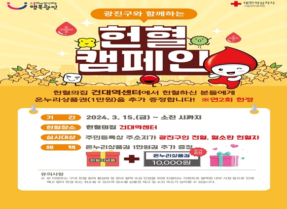 1차로 지난 15일부터, 1천만원의 상품권을'헌혈의 집 건대역센터'에서 헌혈한 구민에게 지급하고 있다.