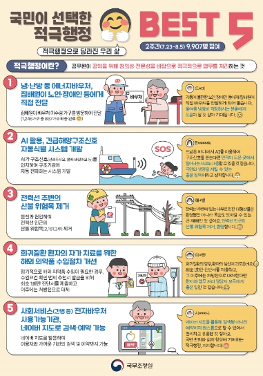 [뉴스서치] 국무조정실은 ’24.6월부터 47개 중앙부처의 적극행정 우수사례에 대해 온라인 국민투표를 거쳐 ‘국민이 뽑은 적극행정 우수사례 BEST 5’를 선정하고 있다.