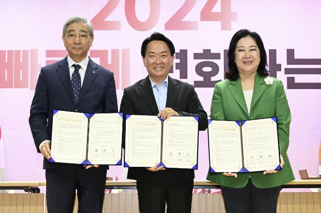 ▲ 윤동섭 연세대학교 총장, 이성헌 서대문구청장, 김은미 이화여자대학교 총장(왼쪽부터)이 ‘경의선 지하화 선도사업 추진 공동위원회 업무 협약’ 후 기념 촬영을 하고 있다. |