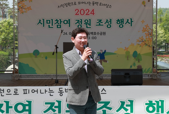 ▲ 지난 27일 동백호수공원에서 열린 '2024 시민참여 정원 조성 행사'에서 축사를 하고 있는 이상일 용인특례시장 |