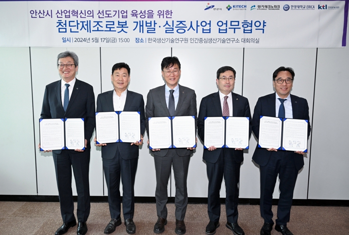 안산시는 한국생산기술연구원, (재)경기테크노파크, 한양대학교ERICA, 한국산업기술시험원과 첨단제조로봇 개발·실증사업 추진을 위한 업무협약을 체결했다고 17일 밝혔다.