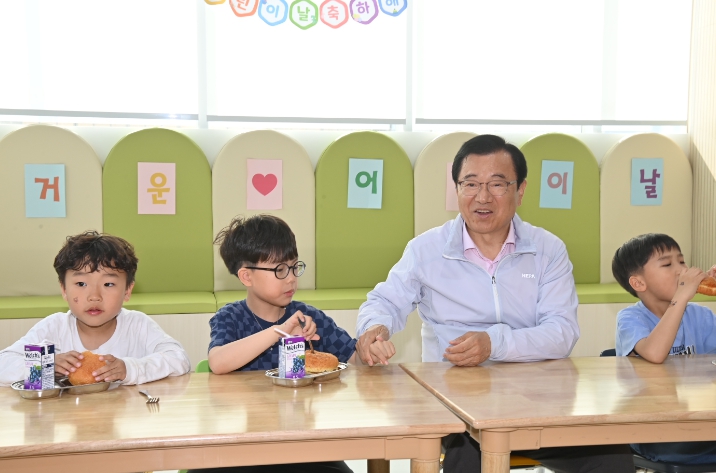 ▲ 이현재 하남시장이 3일 하남시 원도심에 위치한 종합복지타운에 위치한 다함께돌봄센터를 방문해 지역 돌봄서비스를 점검했다. 사진은 이현재 하남시장과 아이들이 간식 시간을 함께하고 있는 모습 |