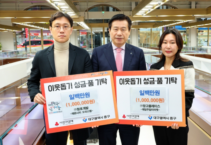 [뉴스서치] ㈜청호개발·㈜망고플레이스는 28일 제일주얼리마켓(동성로 64, 1층)에서 중구청에 이웃돕기 성금 200만원을 기탁했다.
