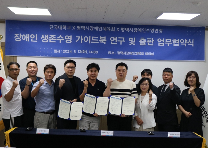 [뉴스서치] 평택시 장애인체육회는 지난 13일(화) 단국대학교와 평택시 장애인수영연맹과 함께 ‘장애인 생존수영 가이드북 연구 및 출판 업무협약’을 체결했다고 밝혔다.