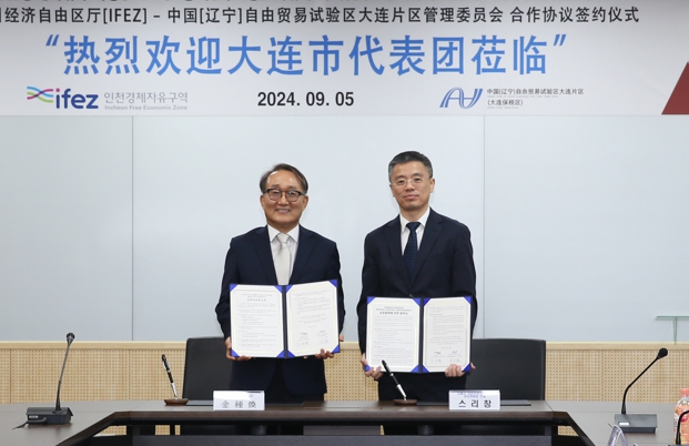 이어 김종환 경제청 투자유치사업 본부장과 중국 랴오닝 자유무역시험구 다롄지역관리위원회 스리창 주임이 협약서에 사인을 했다.