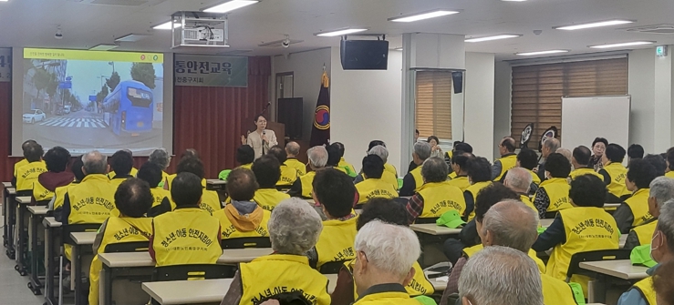 이날 교육은 고령자의 안전보행 방법, 무단횡단 금지의 중요성, 교통 승하차 시 유념해야 할 사항 등을 강의와 동영상을 통해 어르신들이 쉽게 알 수 있도록 진행됐으며, 고령운전자에 대한 양보와 배려의 교통문화가 조성될 수 있도록 실버차량 스티커와 교통안전 홍보물도 배부했다.