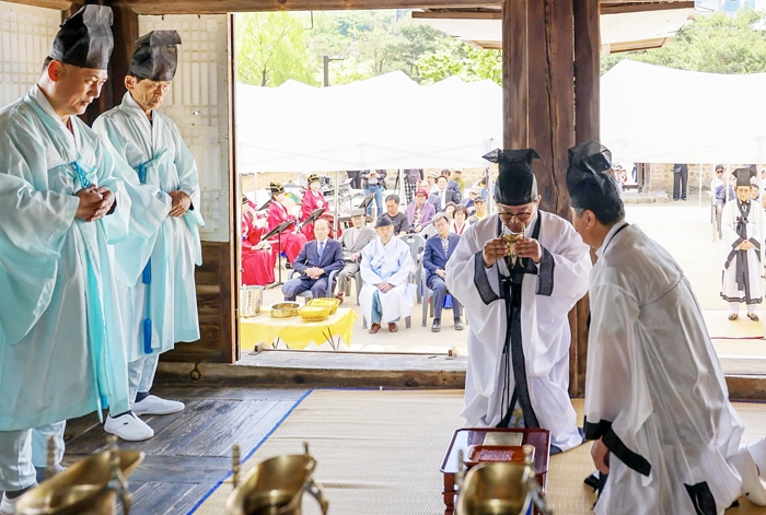 ▲ 최충규 대덕구청장(사진 가운데)이 27일 동춘당 선생을 기리는 ‘숭모제례’에서 초헌관으로 잔을 올리고 있다. |