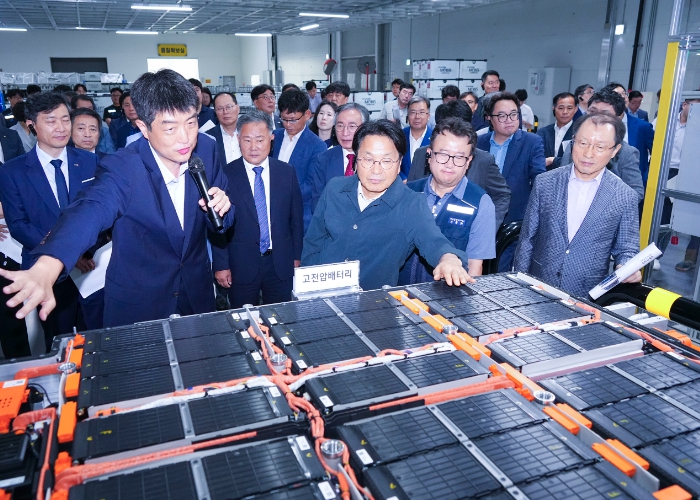 ▲ 강기정 광주광역시장이 28일 오전 광주글로벌모터스(GGM)를 방문해 시 산하 공공기관장들과 캐스퍼 전기차(EV)에 탑재되는 배터리 특·장점에 대한 설명을 듣고 있다./광주광역시 제공 |