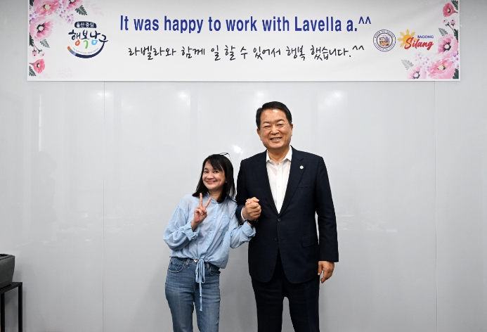 이에 서동욱 남구청장은 "라벨라 씨가 울산 남구에서 지난 1년간 보고 느낀 경험이 실랑시에 조금이나마 도움을 줄 수 있길 바라며, 우호교류도시인 실랑시와 지속적인 교류에 지원을 아끼지 않겠다.”고 말했다.