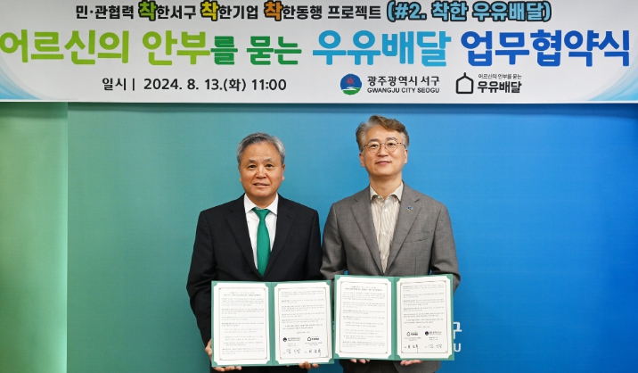 [뉴스서치] 광주광역시 서구가 (사)어르신의 안부를 묻는 우유배달(이사장 호용한)과 ‘민관협력 착착착(착한서구 착한기업 착한동행) 프로젝트’를 위해 손을 맞잡았다. 양 기관은 13일 취약계층 독거 어르신의 고독사를 예방하기 위한‘착한 우유배달’업무협약을 체결했다.
