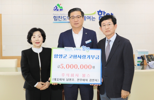 [뉴스서치] 함양군을 사랑하는 마음을 담아 남영조 주식회사 불스 대표이사와 김인숙 전무이사가 함양군 고향사랑기부제에 고액(500만 원)의 기부금을 전달했다.
