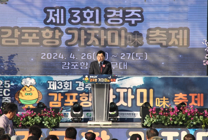 ▲ 주낙영 시장이 27일 제3회 경주 감포항 가자미 축제 기념식에 참석해 인사말씀을 하고 있다. |
