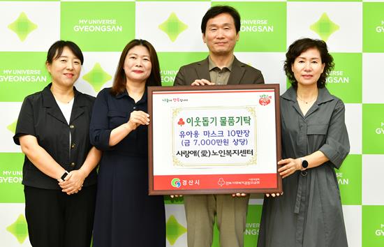 [뉴스서치] 경산시 대평동 소재 사랑애(愛)노인복지센터는 28일 경산시청을 방문해 지역 아동들의 건강 증진과 감염병 예방을 위해 유아용 마스크 10만 장(7천만 원 상당)을 기탁했다.
