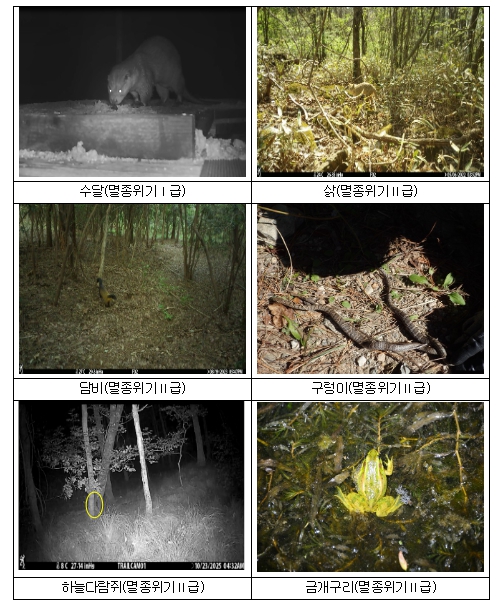조사 결과, 확인된 멸종위기 야생생물 9종은 Ⅰ급 수달을 비롯해 Ⅱ급 8종(삵, 담비, 구렁이, 하늘다람쥐, 금개구리, 표범장지뱀, 참매, 새매)이다.