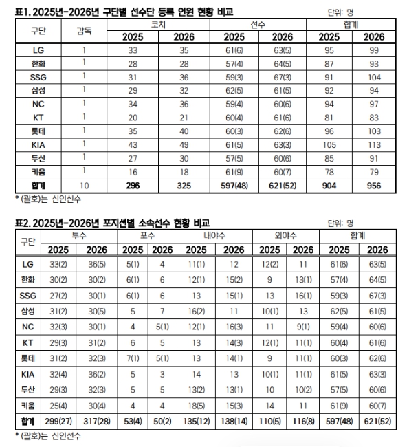[뉴스서치] KBO는 2월 10일(화) 2026년 KBO 리그 소속 선수 명단을 공시했다. 10개 구단은 총 621명의 선수를 등록해, 597명이 등록했던 2025년보다 24명이 늘어났다.