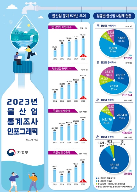 [뉴스서치] 환경부는 2022년 기준 물산업 전반에 대한 현황과 실태를 담은 ‘2023 물산업 통계조사’ 결과를 공개했다. 물산업 통계조사는 물산업 분야 주요 정책수립의 기초자료로 활용하기 위한 국가승인통계다.
