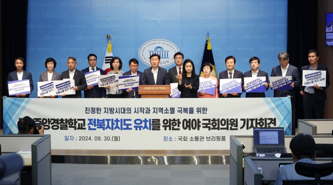 전북특별자치도는 지역 국회의원 및 연고·동행 국회의원, 남원시 등과 30일 국회 소통관에서 기자회견을 열고 제2중앙경찰학교 남원 유치의 필요성을 강력히 촉구했다.