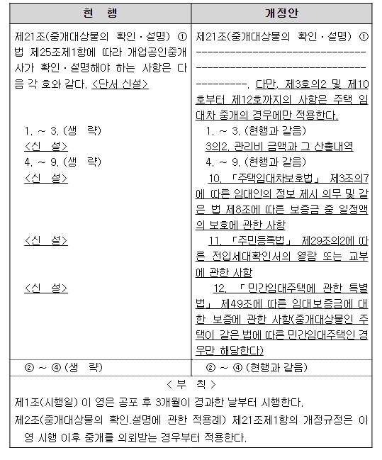 개정 내용의 실효성을 높이기 위해 공인중개사가 확인․설명한 내용은 ‘중개대상물 확인․설명서’에 명기하고, 공인중개사․임대인․임차인이 같이 확인․서명토록 했다.