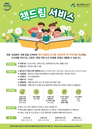 [뉴스서치] 울산 남구 구립도서관은 4월 2일부터 12월까지 맞춤형 도서대출 ‘책드림 서비스’를 운영한다고 밝혔다.