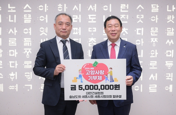 [뉴스서치] 세종특별자치시가 26일 시청 세종실에서 대한건설협회 충남도회·세종시회 세종시협의회 임규성 사무총장에게 세종 고향사랑기부금 500만 원을 전달받았다.