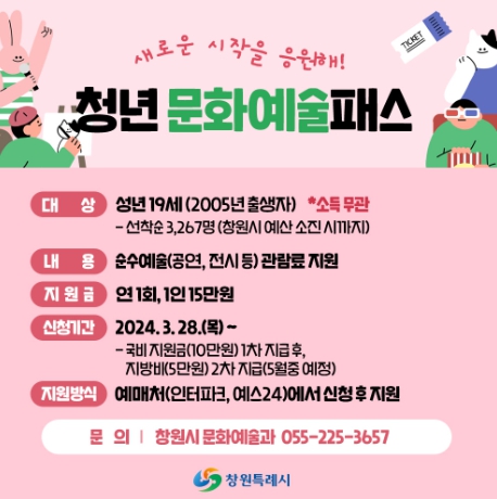 [뉴스서치] 창원특례시는 오는 28일부터 19세 청년(2005년 출생자)을 대상으로 청년 문화예술패스 사업을 실시한다고 밝혔다.