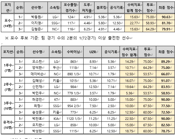 ▲ 2024 KBO 수비상 포수, 내야수 부문 결과 |