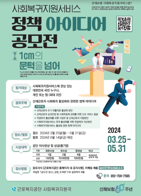 박종길 이사장은 “이번 공모전을 통해 국민의 생각과 아이디어를 폭넓게 수렴하여 산재근로자의 직업 및 사회복귀의 중요성을 확산하고 더 필요한 사람에게 더 나은 서비스를 제공할 수 있도록 산재보험 패러다임을 사회복귀 중심의 사회서비스로 전환하겠다”라고 말했다.