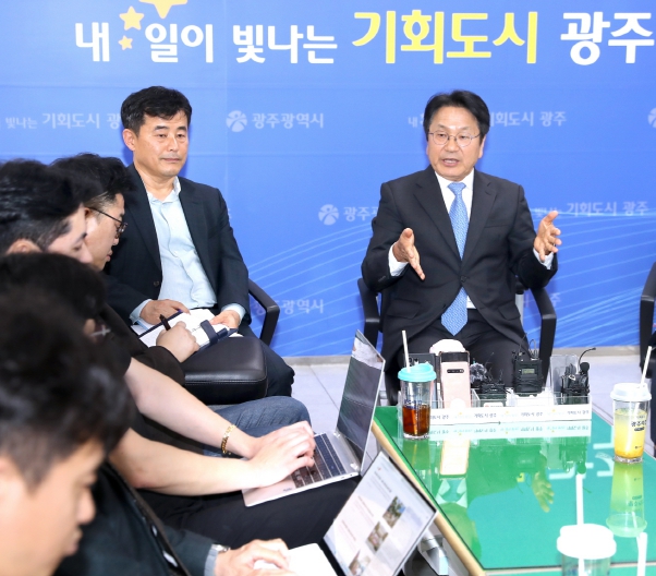 | ▲ 강기정 광주광역시장이 14일 오후 시청 5층 기자실에서 출입기자들과 차담회를 갖고 시정 주요현안 등에 대해 설명하고 있다. |