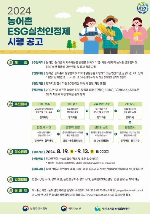[뉴스서치] 농림축산식품부, 해양수산부, 대·중소기업·농어업협력재단(김영환 사무총장)은 농어촌 환경·사회·투명경영(ESG) 활동에 기여한 우수 기업·기관을 인정하고 홍보하기 위한 ‘2024년 농어촌 환경·사회·투명경영(ESG) 실천인정제’를 시행한다고 밝혔다.