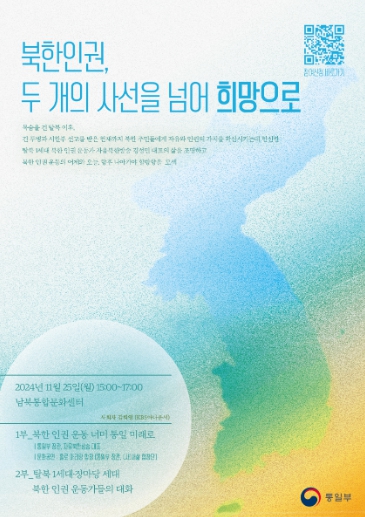[뉴스서치] 통일부는 11월 25일 오후 3시부터 통일부 남북통합문화센터 대강당(서울시 강서구)에서 ‘북한 인권, 두 개의 사선을 넘어 희망으로’를 주제로 토크콘서트를 개최한다.