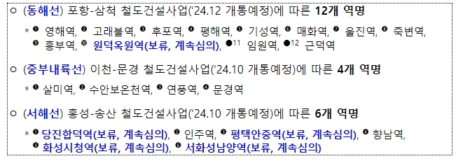 이번 위원회에서 역명을 심의한 역들은 동해선 포함~삼척 구간(단선), 중부내륙선 충주~문경 구간(단선), 서해선 홍성~송산 구간(복선)에 있다. 해당 사업들은 올해 하반기 개통을 목표로 마무리 공사를 진행 중이다.
