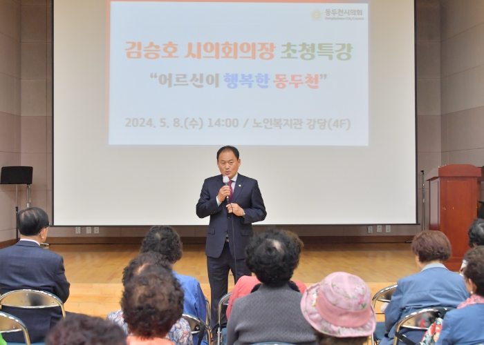 [뉴스서치] 동두천시의회 김승호 의장은 지난 5월 8일, 동두천시 노인복지관에서 열린 어버이날 행사에서 '어르신이 행복한 동두천'이라는 제목으로 특강을 진행했다.