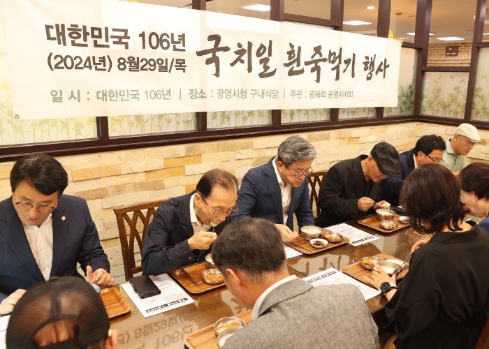 ▲ 광명시는 광복회 광명시지회)와 함께 29일 경술국치일을 기억하고자 시민들과 함께 ‘찬 흰죽 먹기 행사’를 진행했다. 사진은 정순욱 부시장(왼쪽 세번째)이 광복회 광명시지회 회원들과 시청 구내식당에서 흰죽을 먹는 모습. |
