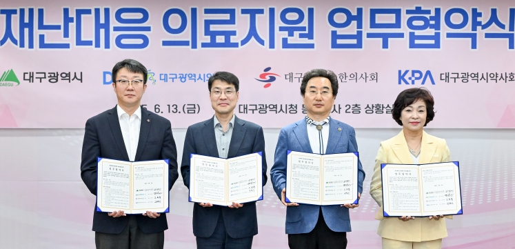 대구시 의·약단체장은 “재난 발생 시 시민의 건강과 생명을 지키는 것은 의료인의 기본 책무로 맡은 업무에 적극적으로 협조하겠다”며, “이번 협약을 계기로 신속한 의료지원을 위한 상호협력 체계가 구축될 것으로 기대한다”고 말했다.