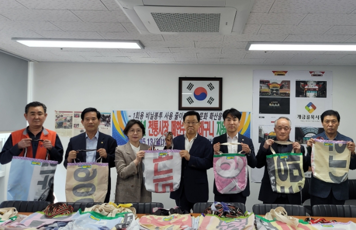 구는 지난 13일, 폐현수막을 재활용하여 만든 장바구니 2,000개를 개금골목시장 상인회에 전달했다. 앞으로 상인회에서는 장바구니를 시장 상인들에게 전달하여 시장 이용객들에게 1회용 비닐봉투 대신 장바구니를 제공하는 등 1회용품 사용 줄이기와 다회용품 사용의 생활화로 친환경 부산진구를 만들어 갈 예정이다.