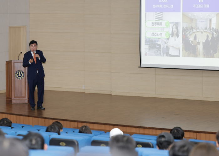 이 시장은 학창 시절부터 공직자 생활까지 ‘청주시장’이라는 꿈을 갖고 도전하는 과정을 진솔하게 풀어가는 것을 시작으로, 시민과의 소통, 청년정책, 그리고 충청권 메가시티 핵심도시로 나아가기 위한 청주시 발전 방향을 설명하는 방식으로 강의를 진행했다.