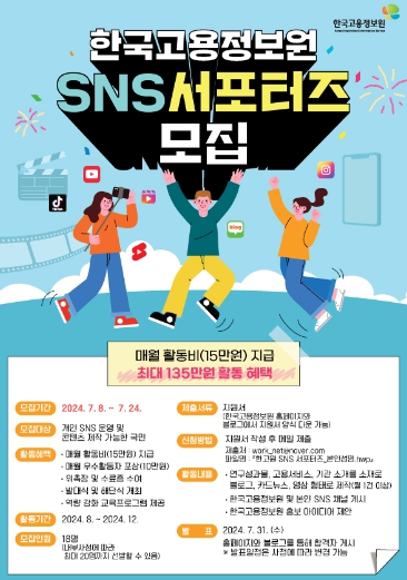 한국고용정보원 관계자는 “이번 ‘SNS 서포터즈’는 지난해부터 운영해 온 ‘KEIS 연구기자단’의 활동을 넘어서 연구사업뿐만 아니라 기관 차원의 홍보로 확대한 국민 참여 활동이다”라며, “최근 경향인 짧은영상(숏폼)을 포함해 참신한 아이디어와 신박한 콘텐츠를 제작할 수 있는 분들의 많은 참여를 바란다”라고 전했다.