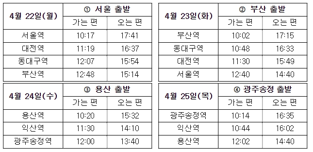 시승열차는 22일과 23일은 경부선(서울↔부산 왕복, 서울‧대전‧동대구‧부산 승차), 24일과 25일은 호남선(용산↔광주송정 왕복, 용산‧익산‧광주송정 승차)을 총 8회 운행한다.