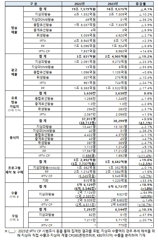 매출 항목에서는 방송광고 매출이 ’22년 대비 5,926억 원 감소(△19.2%)한 2조 4,905억 원으로 집계되어 3조 원을 밑돌았으며, 종합유선방송(SO)을 제외한 모든 사업자가 감소한 것으로 나타났다.